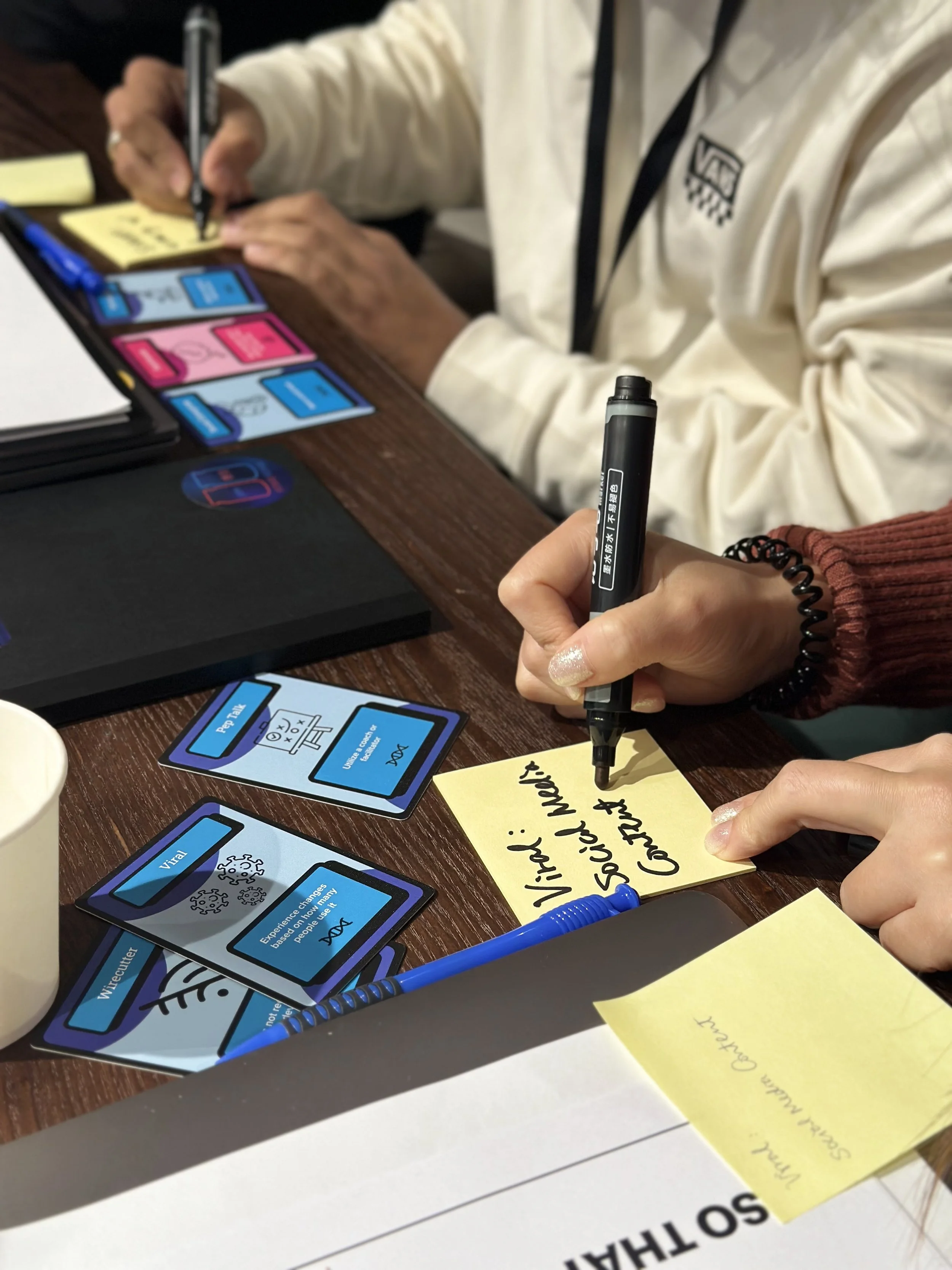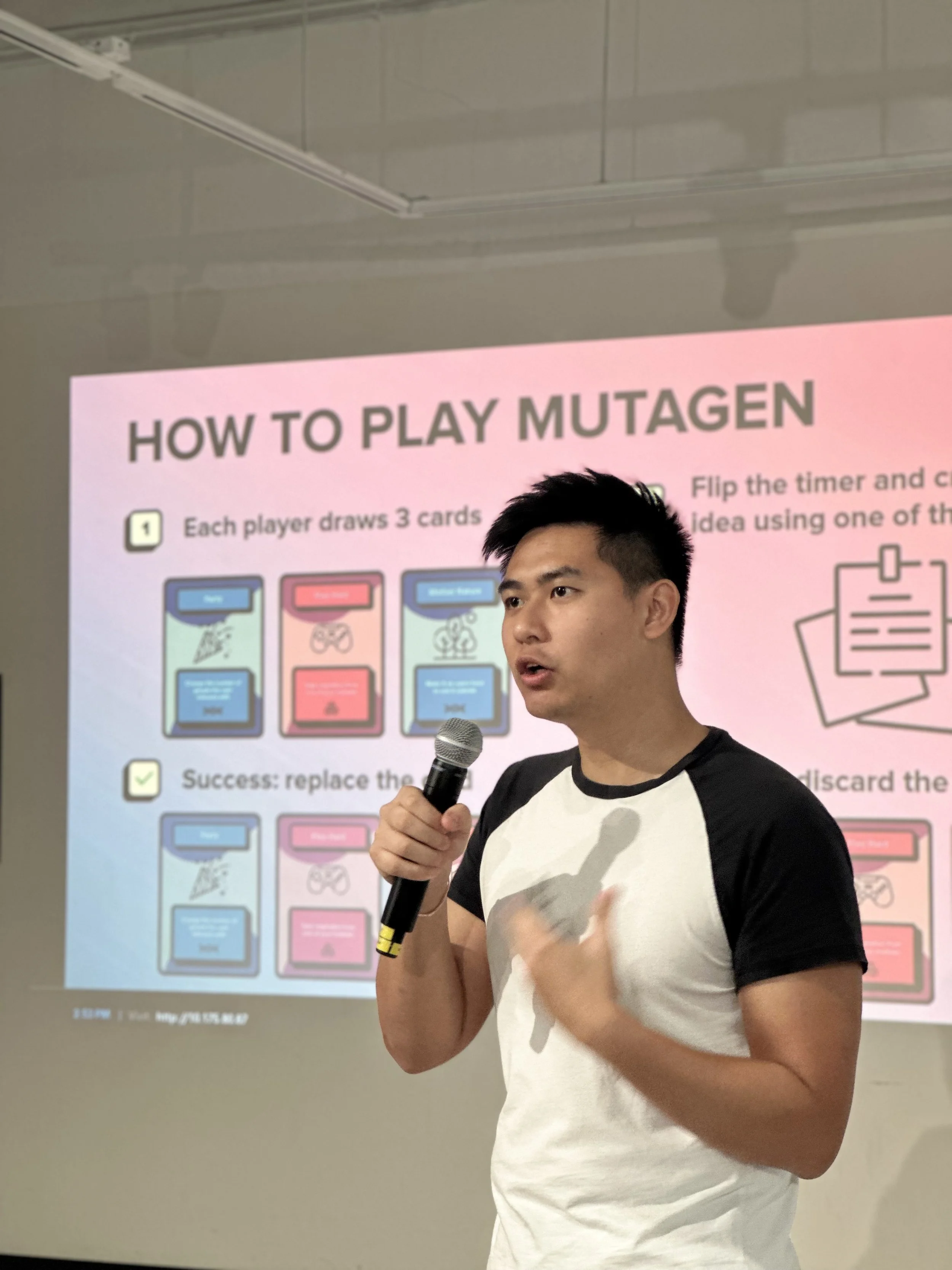 The second gamemode was a slower one, aimed at players who didn’t want to compete with other players or have to blurt their ideas out. In this gamemode, players would create an idea using one of three cards within two minutes. This still presented a challenge, but more importantly, it had all the benefits of brainwriting (more ideas and diversity) plus the benefits of the Mutagen cards (more creative ideas and faster). This gamemode was optimized for larger groups, faster ideation, and more diversity.