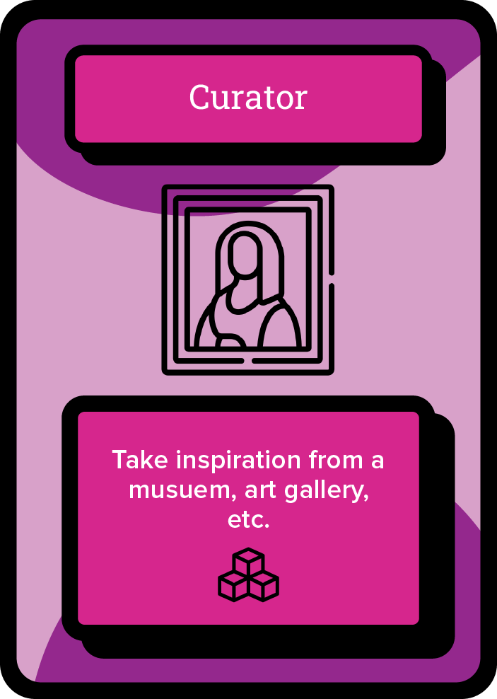 Choice paralysis was the second obstacle to tackle. I did this by using cards and giving each card its own prompt. This meant that users would have to use the prompt they received, and couldn’t keep reverting to the same sources of inspiration they would always use. I used cards as users would draw random cards from a deck, truly forcing them out of their comfort zone, but guiding them through constructing their idea.